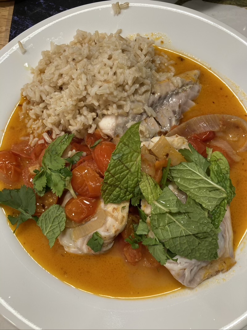 The tasty news: The New York Times published a One Pot Meals section in February, 2020. It was in the edition that arrived on the day we returned from our Costa Rica/Panama trip. I saved it, even though we weren’t doing a lot of cooking at the time; we’ve finally started using some of the recipes. Tonight’s new recipe was Tomato-Poached Fish With Chile Oil and Herbs, and, even though I didn’t quite follow the recipe correctly (I left the garlic and shallots in the pan instead of saving them for the end, and my timing with the red pepper flakes was wrong, too), it came out pretty good – certainly worth trying again.