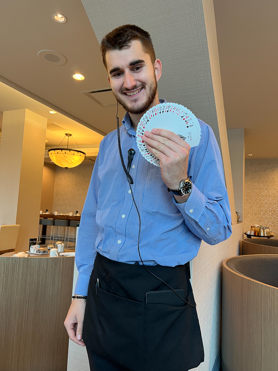We had breakfast at the hotel – it was a buffet, which was not at all surprising. What was surprising was what our waiter, Milenko, did when he brought us the bill – he also brought a deck of cards and did a few magic tricks, making cards appear and disappear right under my nose.