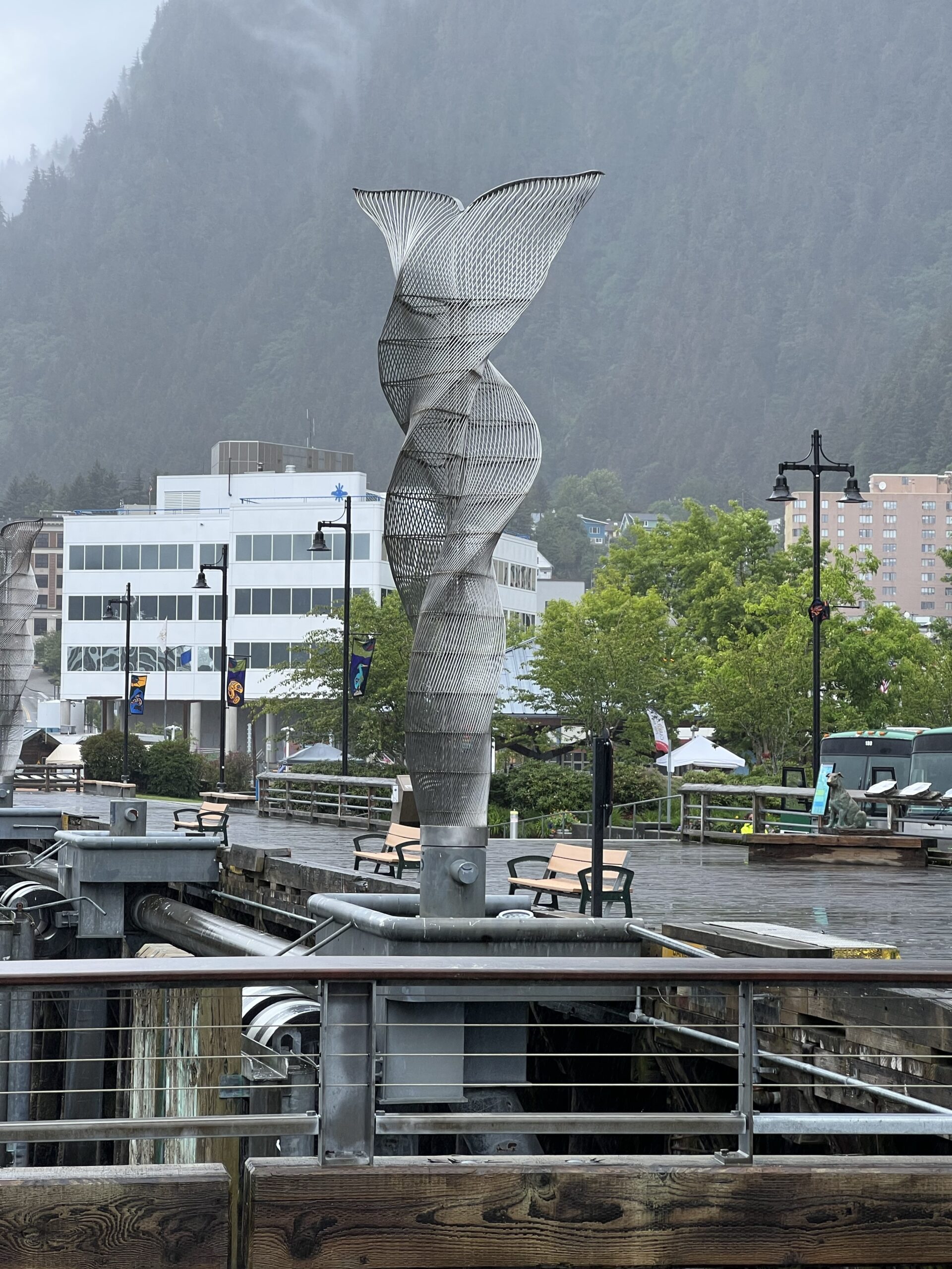 The whale watching was more successful. We walked off the ship and onto a bus, with just enough time to take a photo of one of the interesting fishy sculptures on the pier.