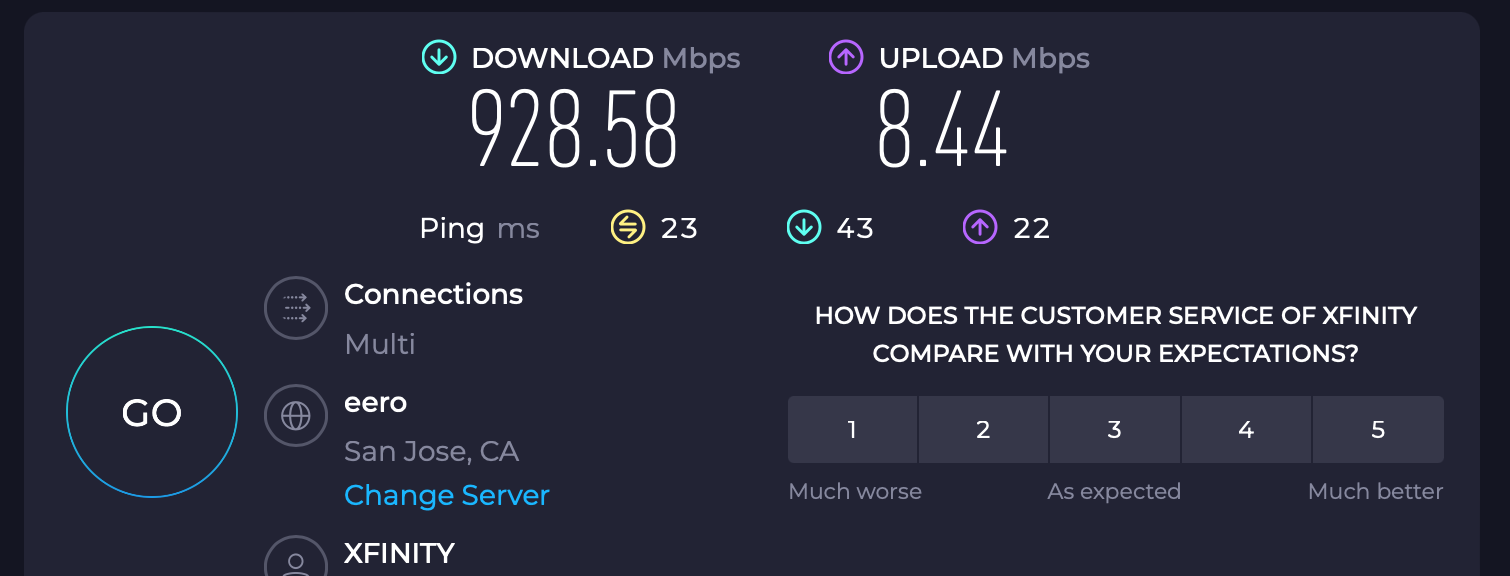The tech arrived today; we did a speed test on my office computer, which got 30Mbps downstream and about 40 upstream – I’m supposed to get nearly 1Gbps down and 40 up. The tech tried plugging the cable directly into his “meter” and got proper speeds – but he also found a lot of errors and variation in signal strength level, so he wanted to investigate more.