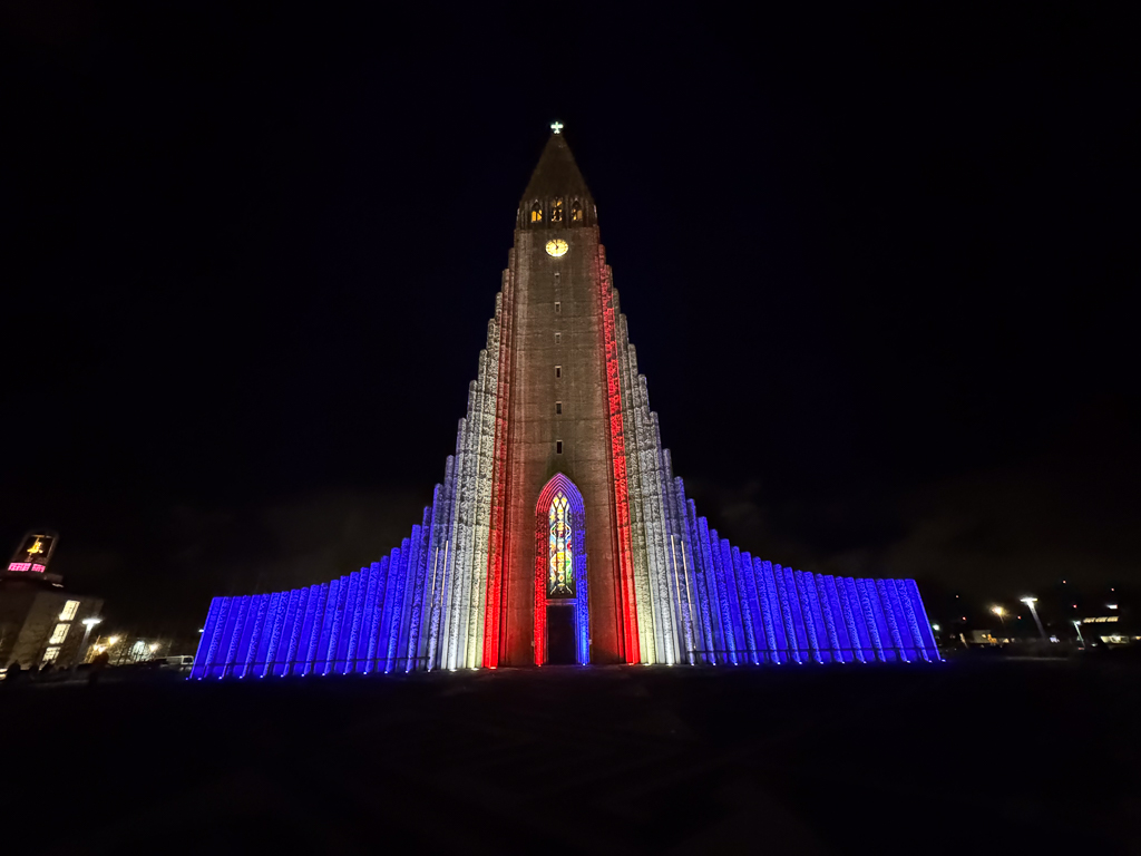 Once we’d gotten to the Borg Hotel and dropped off our luggage, we went out for a short walk, going up the rainbow street all the way to Hallgrímskirkja church to enjoy seeing it lit up.