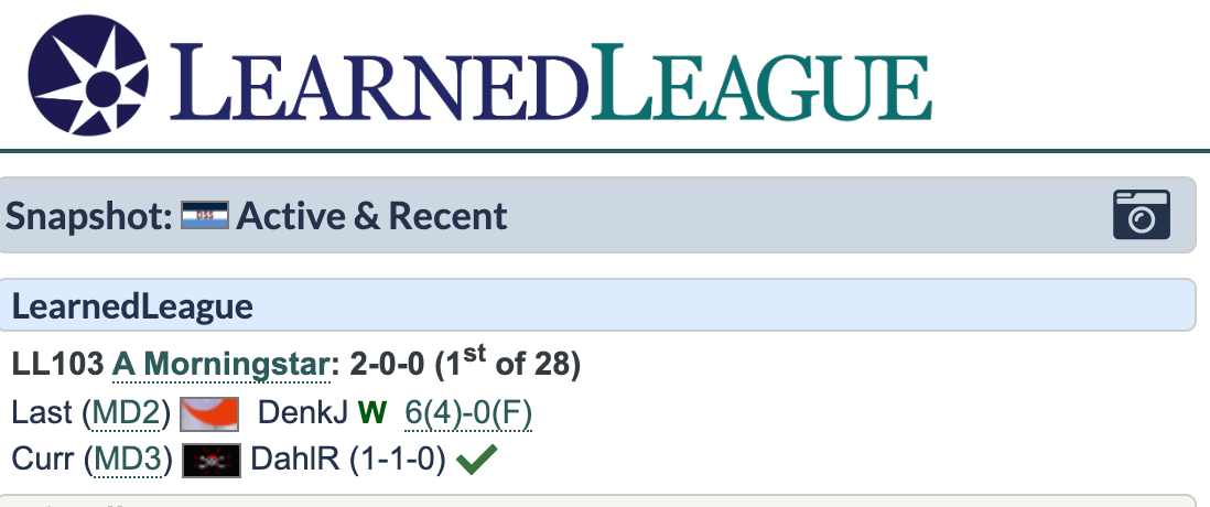 My morning results email from LearnedLeague contained a surprise: I am currently first in my rundle (A Morningstar)! The last time I was in the A (top) rundle, I spent the entire season in the relegation zone (bottom 3)!