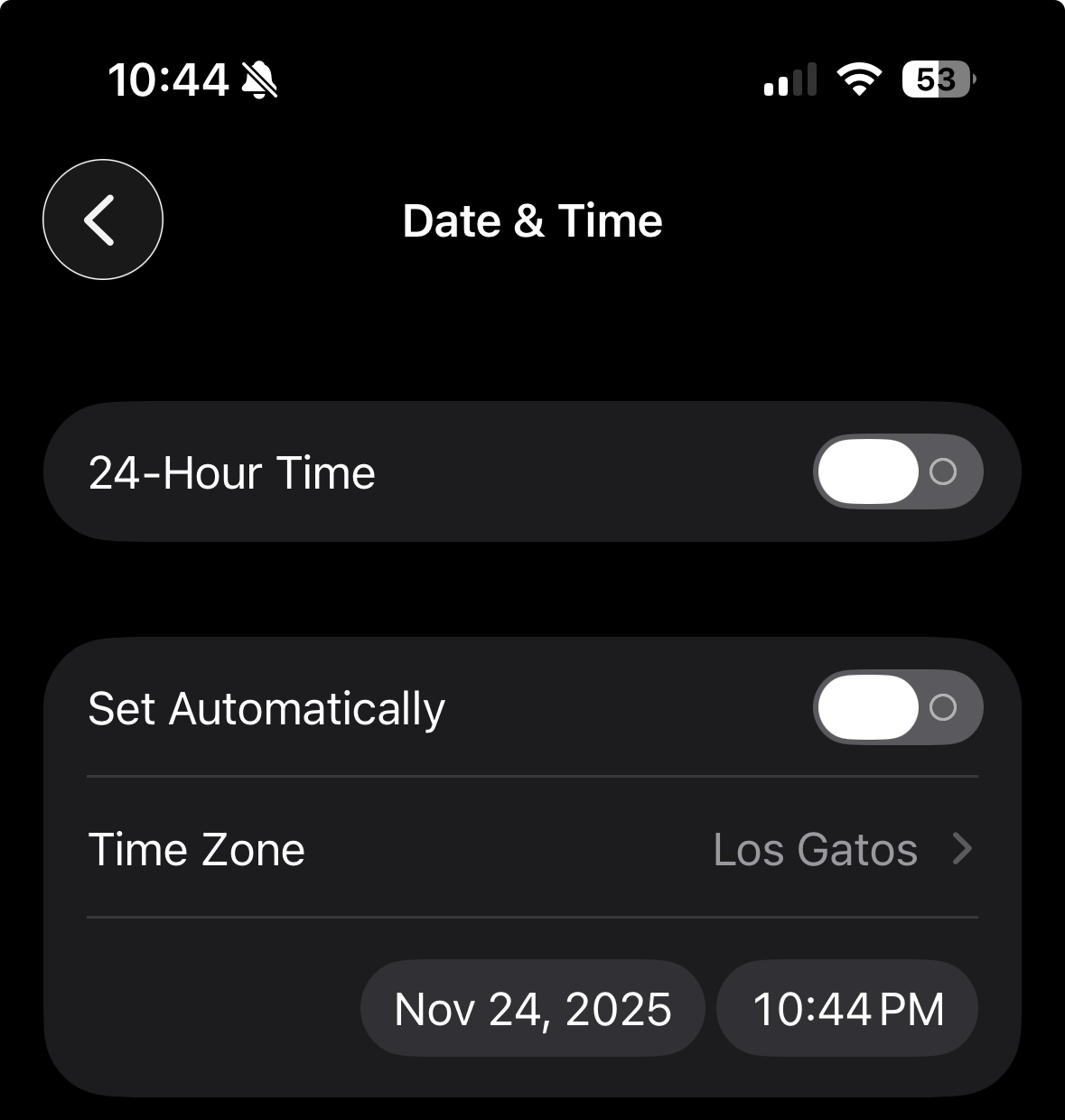 I could have fixed the problem by manually resetting the time and date using the little boxes at the bottom of the picture, but it’s easier to just let the phone do it all – I may still turn off the automatic setting the next time I get on a plane, but I will be damn sure to turn it back on when I get to my destination!